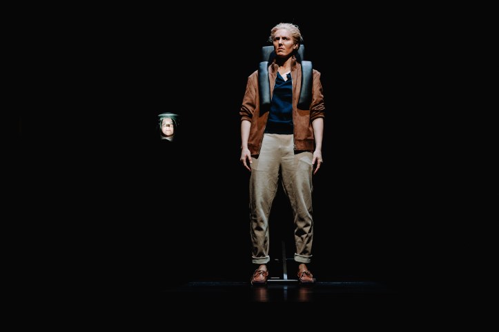 The production’s sharp and brutal aesthetic is striking in its precision. The projections, designed by Denyse Karn (Studio 180’s A Public Display of Affection), with a strong helping hand by lighting designer André Du Toit (Factory’s Here Lies Henry), create a multimedia distortion field that mirrors his disorientation, especially when the lawyer looms large (and too close) over the stage like a glitching legal deity. Then there is the floating head of Duckie, an AI assistant tasked with guiding him through his new role. That visual, magnificently concocted, demands a cold, “Clockwork Orange” logic that becomes more disturbingly sinister with each task. The whole design team, including sound designer S. Quinn Hoodless (Factory’s Honey I’m Home) of Public Consumption, works in wicked astute synergy, where every rewiring effect and every sudden illumination feels clean, sharp, and surgically placed to jolt the audience without resorting to cheap shocks.