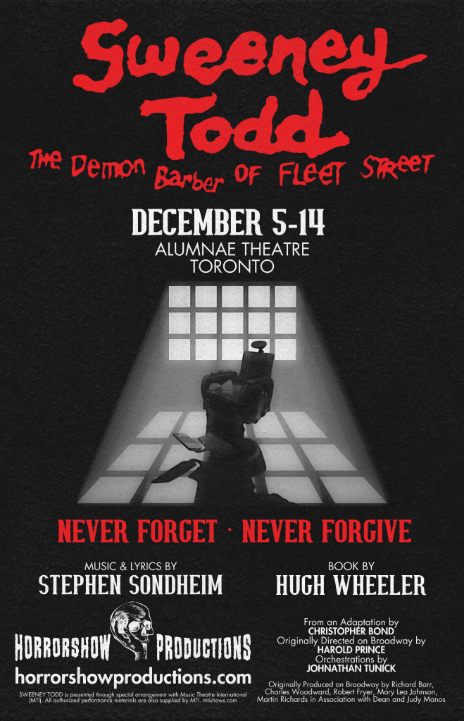 “How it shines in the light,” one might sing out once Horrorshow Productions’ Sweeney Todd, The Demon Barber of Fleet Street, sets its sail for London on the Alumnae Theatre stage. This non-profit community theatre company takes on the powerhouse musical with a delicious sense of place and honor, and the performers rise to it with real commitment. I’ve seen this much-revived show numerous times, most recently on Broadway with two different casts who each uncovered new angles and glimmers inside its tightly coiled design. What I didn’t expect was how quickly this Toronto staging, directed with a clever eye for detail by Jack Phoenix (Horrorshow’s Cabaret), would win me over.