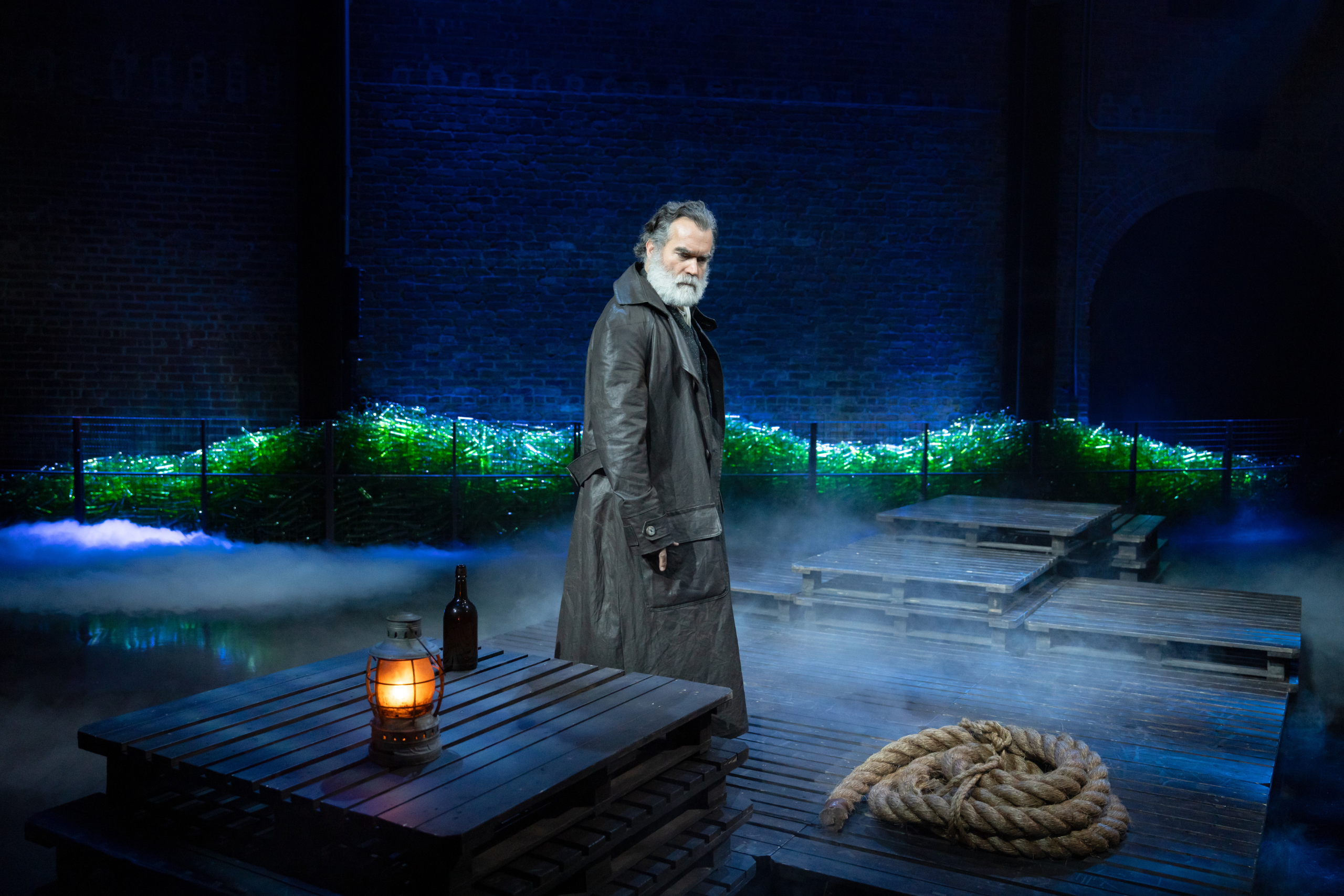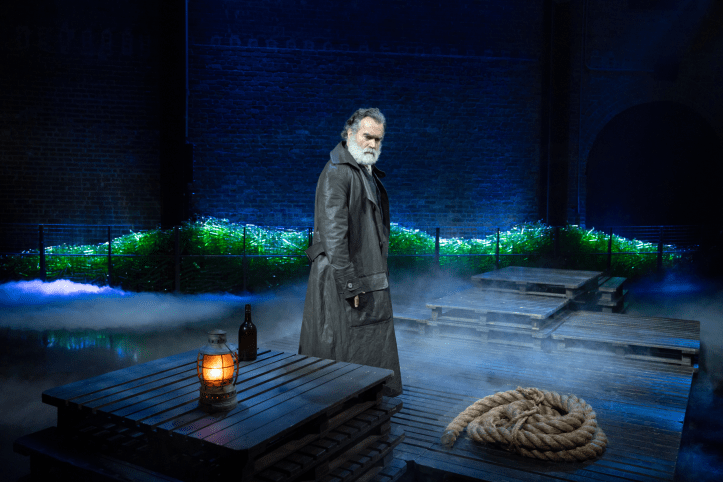 The staging is one of the production’s great strengths. Christine Jones and Brett J. Banakis’s set assembles itself before our eyes from a pile of chairs and platforms into tight ship interiors and worn barrooms where lager and hard liquor flow freely. The space feels constantly in flux, thanks to lighting designer Natasha Katz (Broadway’s Some Like It Hot) and sound designer Nevin Steinberg (Broadway’s The Notebook), mirroring the way the sea flows, and how these characters rearrange their pasts depending on who is listening and what survival requires. A looming steel beam rotates overhead, threatening collapse as the ensemble reconfigures the floor scene by scene, like a balletic crew of masculine seamen reshaping their environment through muscle memory and routine. The green plastic background, however, remains more puzzling. It never fully comes alive as the “old devil sea” so often invoked, and its meaning feels underdeveloped and artificial, rather than symbolic and engaging.