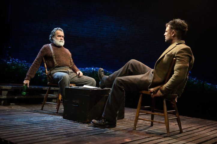 Tom Sturridge (Broadway’s Sea Wall/A Life) delivers a fascinating and deeply embodied portrayal of Mat Burke, moving through the space like a broken ape coiled into a defensive, brooding menace. With waves of sudden vulnerability, his hot-blooded physicality does as much storytelling as his well-crafted voice, suggesting a man shaped by violence and longing in equal measure. Matching him with physical authority and vocal weight, Brian d’Arcy James (Broadway’s Days of Wine and Roses) transforms himself compellingly into Chris Christopherson, Anna’s sailor father, finding depth in bluster and tenderness beneath the character’s stubborn moral absolutism. Together, the two men create a combustible dynamic duel rooted in pride, possessiveness, and unspoken fear, and their scenes crackle with tension, especially when they face off, seated across from one another in combative conflict.