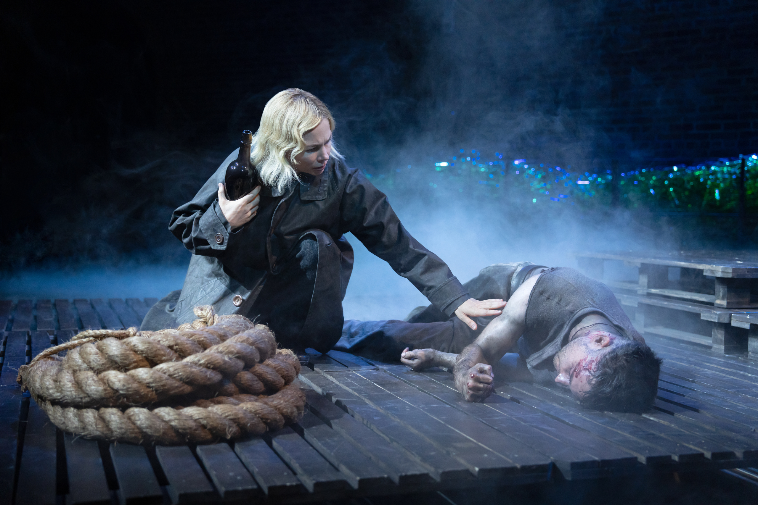 Anna Christie still wrestles, aggressively, with the double standard of sexuality for men and women, laying those ideals bare, mainly because of the richness of its performances. O’Neill’s larger ideas about redemption, identity, and the sea as both corrupting and cleansing emerge unevenly, sometimes landing with blunt insistence rather than emotional accumulation. Yet this production largely transcends those limitations through the rigor of its performances and the intelligence of its staging. What Thomas Kail and this cast achieve is not a reinvention of the text, but a muscular reckoning with it in waves, allowing its wooden fractures to remain visible rather than smoothing them away. It’s solid and seaworthy, making Anna Christie at St. Ann’s Warehouse feel less like a relic revived than a storm weathered. It’s imperfect, bruising, and deliciously shaped by forces larger than the people caught within it, crashing insistently against the social walls that try, and fail, to contain it.