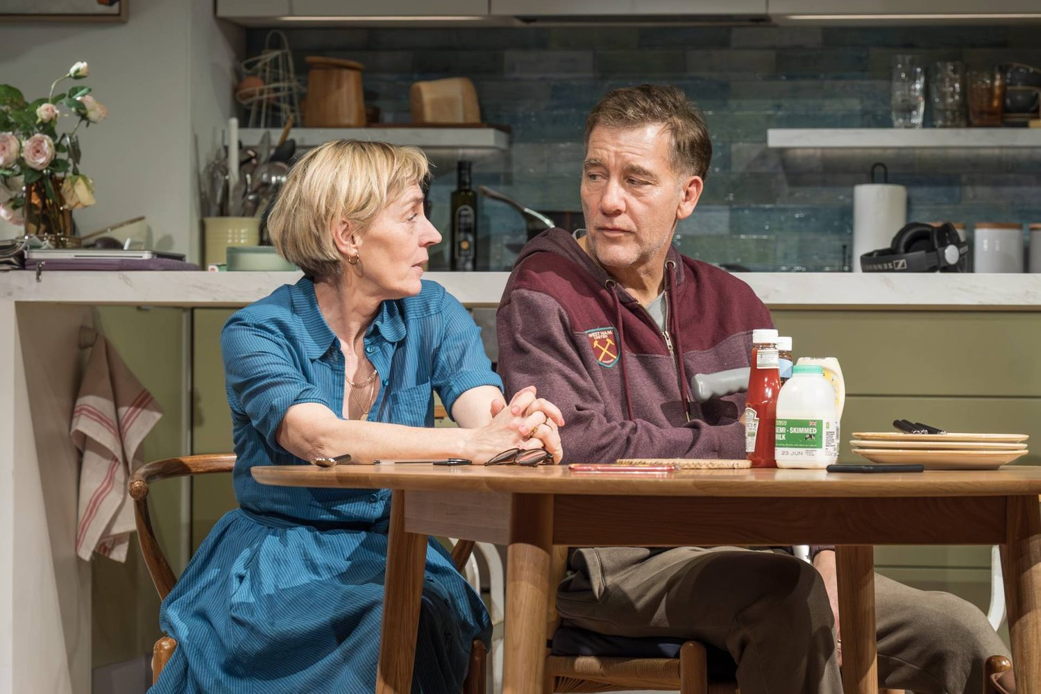 As Alfie, Clive Owen (Broadway’s M. Butterfly) stands beautifully firm while buckling under the tremendous pressure and pain of disease. Saskia Reeves (“Slow Horses“) as his writer wife, Julie, meets his gaze with a generally well-formed honesty. Together, they are, without question, the evening’s greatest strength. Their performances approach a spellbinding quality in their authenticity, rich with shared history and quiet understanding. The ease of their connection is unmistakable, and they find genuine life in Eldridge’s dialogue, even when the material resists momentum. Their love feels real, lived-in, and earned, which makes the emotional restraint of the play all the more noticeable. The ideas explored are poignant and moving, but the way they surface and retreat often drains the tension rather than deepening it.