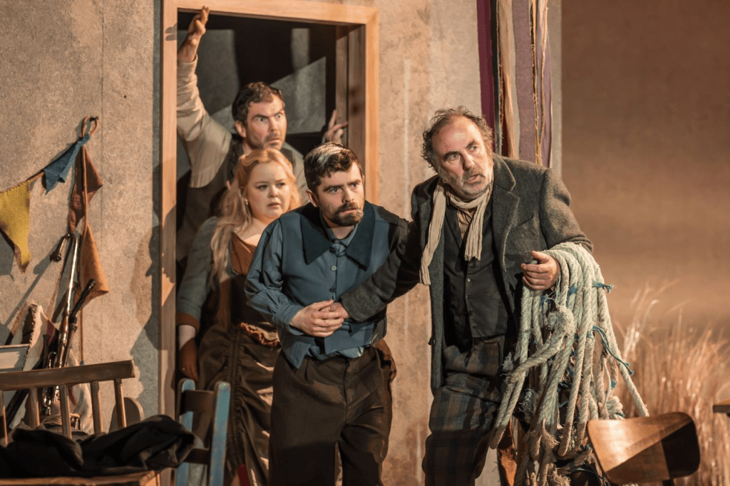 The scale of the staging also works against the play’s intimacy. The Playboy of the Western World thrives on claustrophobia, gossip, and the volatile chemistry of a small community contained within a single space. Here, the breadth of the stage and the emphasis on silhouetted vistas dilute that tight pressure, softening the play’s satirical and combative edge. Moments that should crackle with danger or dark humour instead drift into abstraction, and the production’s tone leans more toward solemnity than mischief for much of the evening.