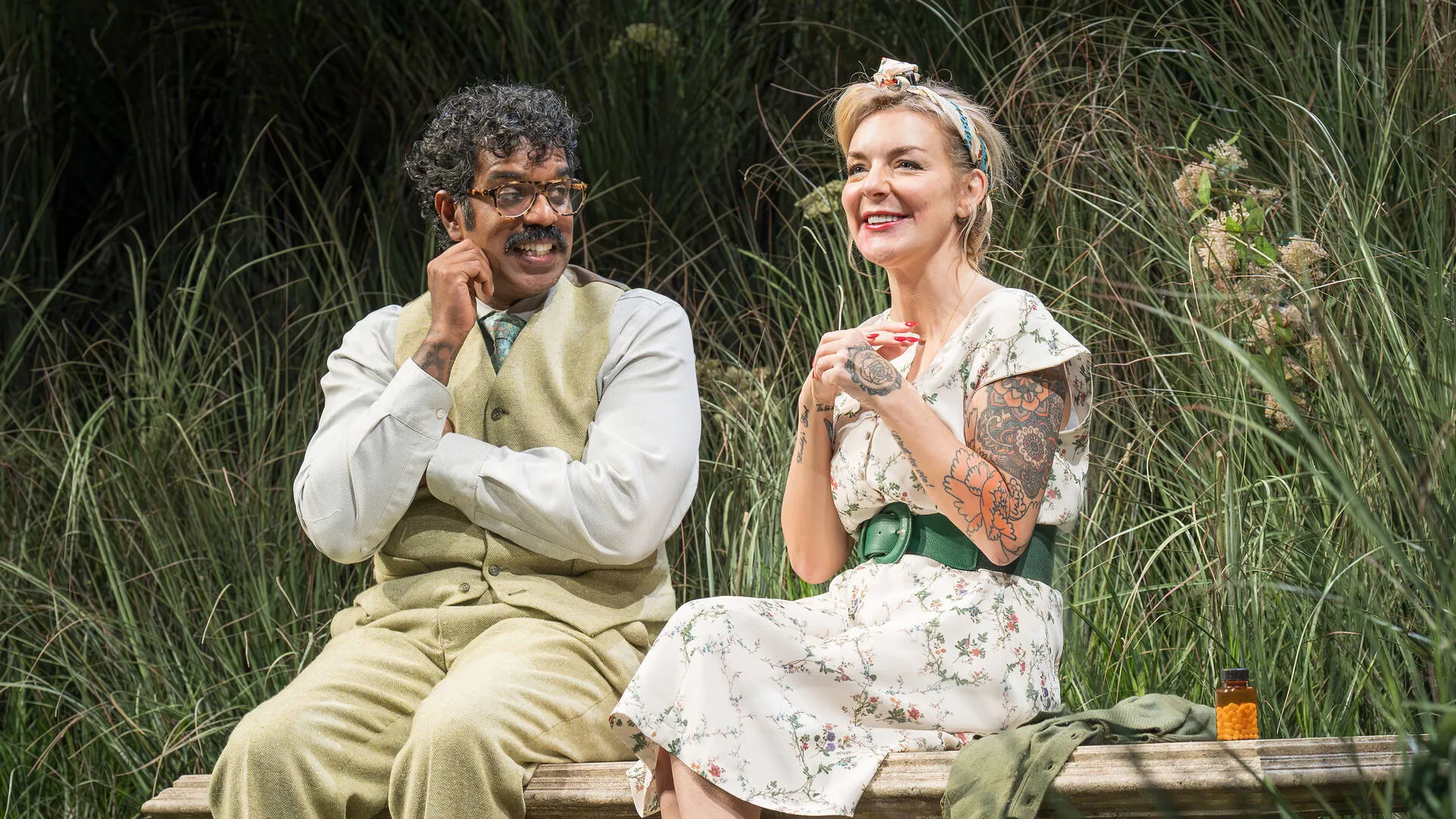 Smith’s captivating Susan is the undeniable centre of this madcap revival, and she navigates the role’s immense demands with clarity and courage. Remaining on stage for the entire evening, Smith charts Susan’s psychological unravelling with precision, allowing humour and horror to coexist uncomfortably in the same moment. Her Susan is not just a victim; she is sharp, brittle, occasionally unkind, and it’s this edge that makes the character so compelling. Around her, the supporting cast is fascinating and superb. Louise Brealey (Channel 4’s “Back“; “Shetland“) and Tim McMullan (NT’s Twelfth Night) are exquisitely irritating as Muriel and Gerald, embodying the petty cruelties and obliviousness that make Susan’s retreat into fantasy feel almost inevitable. Romesh Ranganathan (Showtime’s “Just Another Immigrant“), making his West End stage debut as Susan’s fill-in doctor Bill, proves a genuine asset, his comic timing assured and his interactions with Smith finding unexpected shades of discomfort, warmth, and hilarity.