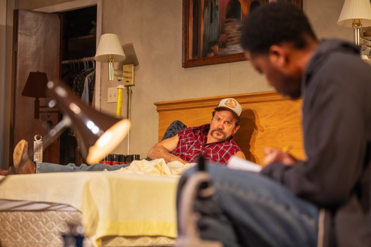 “We’ll never really be safe again,” they tell each other in more ways than one, and the production’s design elements deepen that psychological descent with remarkable control. Takeshi Kata’s set steadily transforms the motel room into a sealed pressure chamber plastered with fear and disturbance, raising the emotional and existential stakes with every rotating shift. Sarah Laux’s costumes, Heather Gilbert’s lighting, and Josh Schmidt’s sound design remain finely tuned to the escalation, guiding us into Peter’s infestation paranoia while daring us to feel it ourselves. Even understanding the diagnosis and recognizing the warning signs, we are pulled into the sensation, scratching at the edges of our belief system, right alongside these desperate characters.