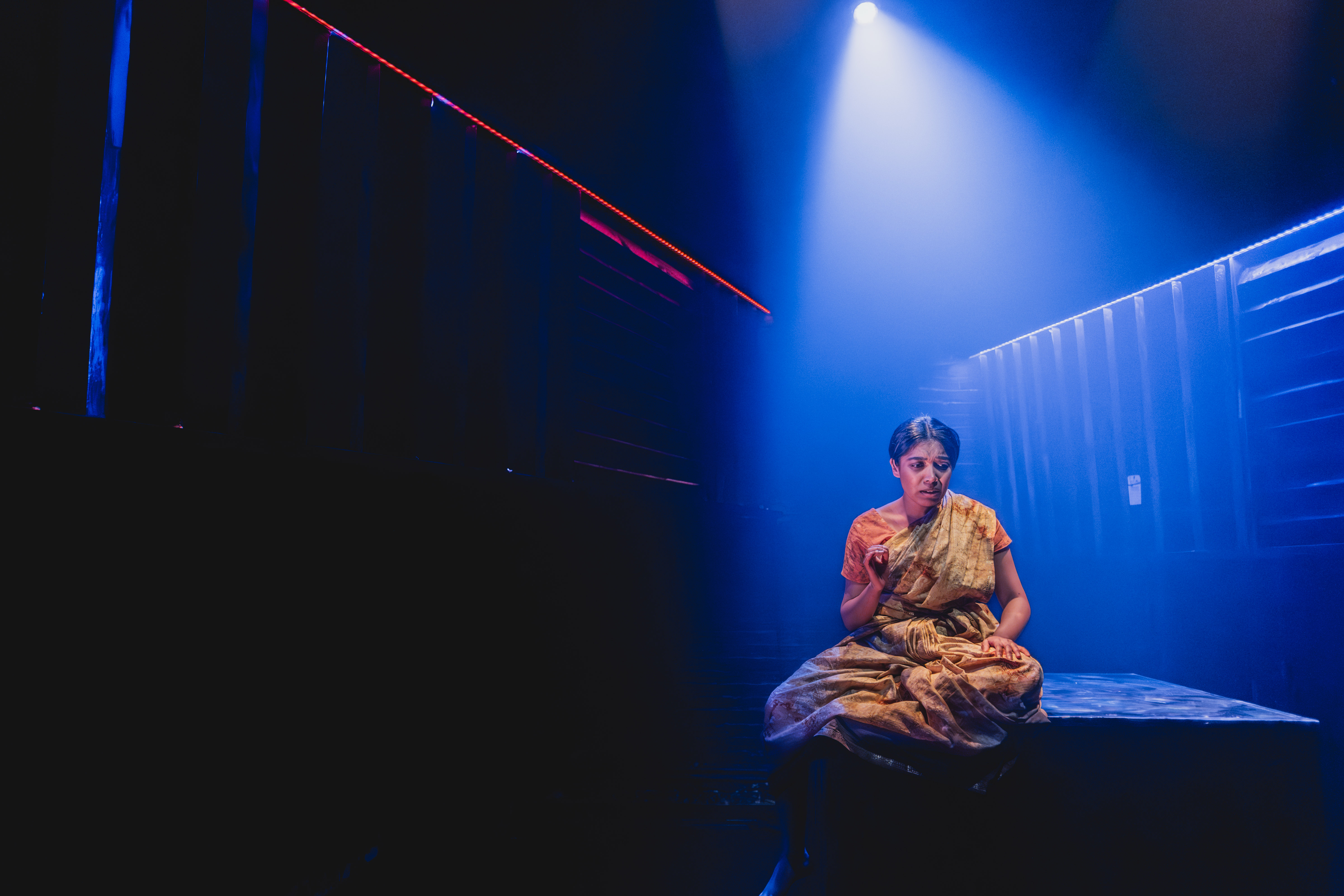 At the center of it all is Gabriella Sundar Singh (Shaw’s Major Barbara), who carries the entirety of Chaya’s journey alone onstage. As the sole performer, Singh embodies not only Chaya’s present crisis but the echoes of her past, the vastness of the world she must navigate, and the unrelenting pull of maternal love. It is a role that demands emotional endurance, technical rigor, and profound empathy, asking the performer to hold both stillness and ferocity in equal measure.