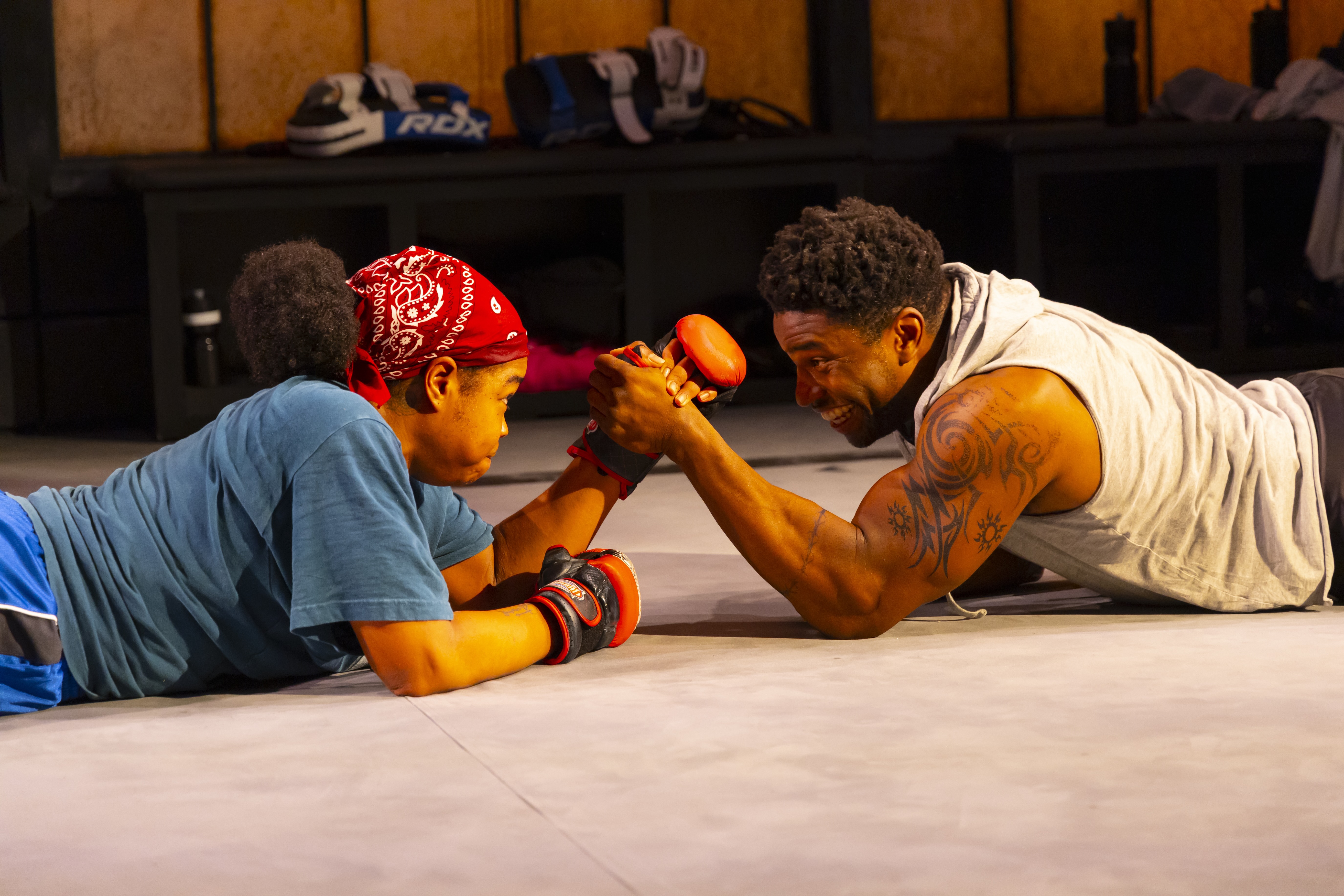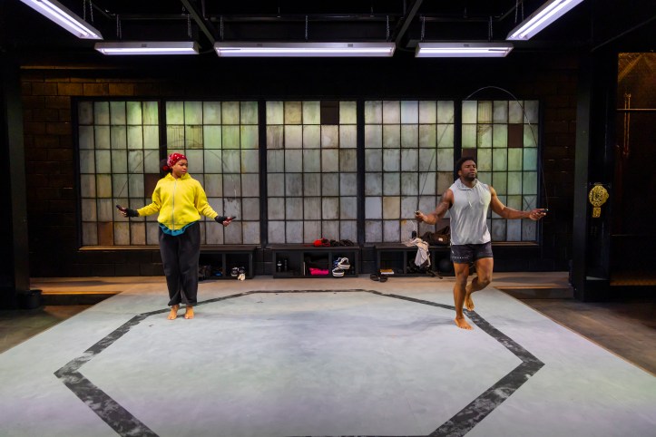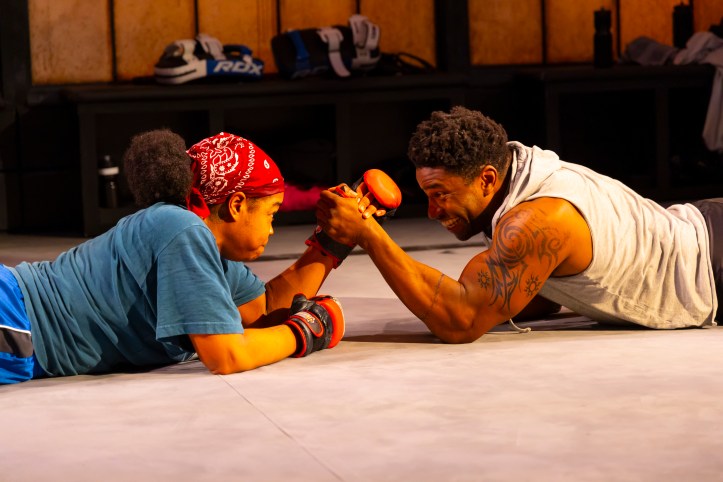 The design elements reinforce this sense of immersion. Andrew Boyce’s sparse, gym-like set, lit tightly by Cha See (Broadway’s Liberation), creates an arena that feels both literal and psychological, a space where confrontation is inevitable, and care, questionable. The sound design by Mikaal Sulaiman (MTC’s Cost of Living) is particularly effective, establishing a visceral atmosphere from the outset. The reverberations of the ring seem to echo through the body, creating a sonic landscape where breath, heartbeat, and impact blur together into something almost internal.