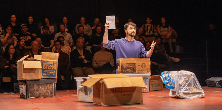 Radcliffe, last seen on the New York stage in Merrily We Roll Along, proves to be an ideal guide through that terrain. His performance is marked by an open, searching earnestness that never feels forced or inauthentic. He greets the audience not as spectators but as collaborators, moving through the space before the show begins with an openness that is inspiring. He connects, placing list items into eager hands, and establishes a tone of trust that carries through the entire seventy minutes. His improvisational ease is particularly striking, allowing each interaction to feel spontaneous and utterly caring, while maintaining a clear emotional through line. It is not simply charm at work, though there is plenty of that. It is a careful calibration of tone, knowing when to lean into humour and when to allow silence to settle or a disco ball to highlight the mood.