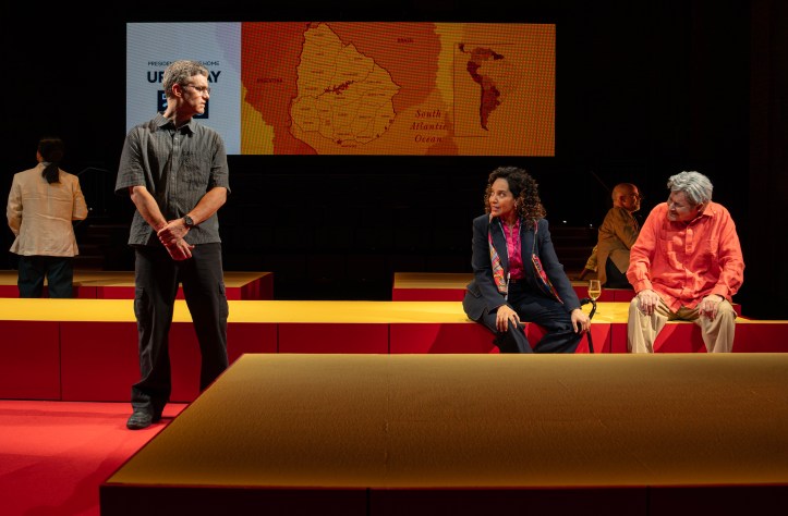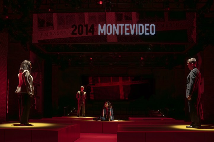 The rest of the cast fills out this world, “flipping between presidents” and time frames with ease, unveiling both expansive and tightly controlled arenas and conflicts. Marinda Anderson (Broadway’s Yellow Face) as Cheryl Mills brings clarity and authority to the floor as outside-the-box decisions are proposed, paused, and take shape. Dan Domingues (Public’s Wild Goose Dreams) provides a compelling counterpoint as Ricardo Zuniga, playing with the rigidness and righteousness of the establishment, as Al Rodrigo (Broadway’s Open Admissions) offers up a connecting and memorable turn as Uruguayan President José Mujica, capturing both the gravity and the unexpected warmth of the role. Barbara Walsh (CSC’s Macbeth) and the rest of the ensemble forcefully add the other layers needed, moving fluidly between characters, and help map the shifting terrain of international diplomacy with precision and focus.