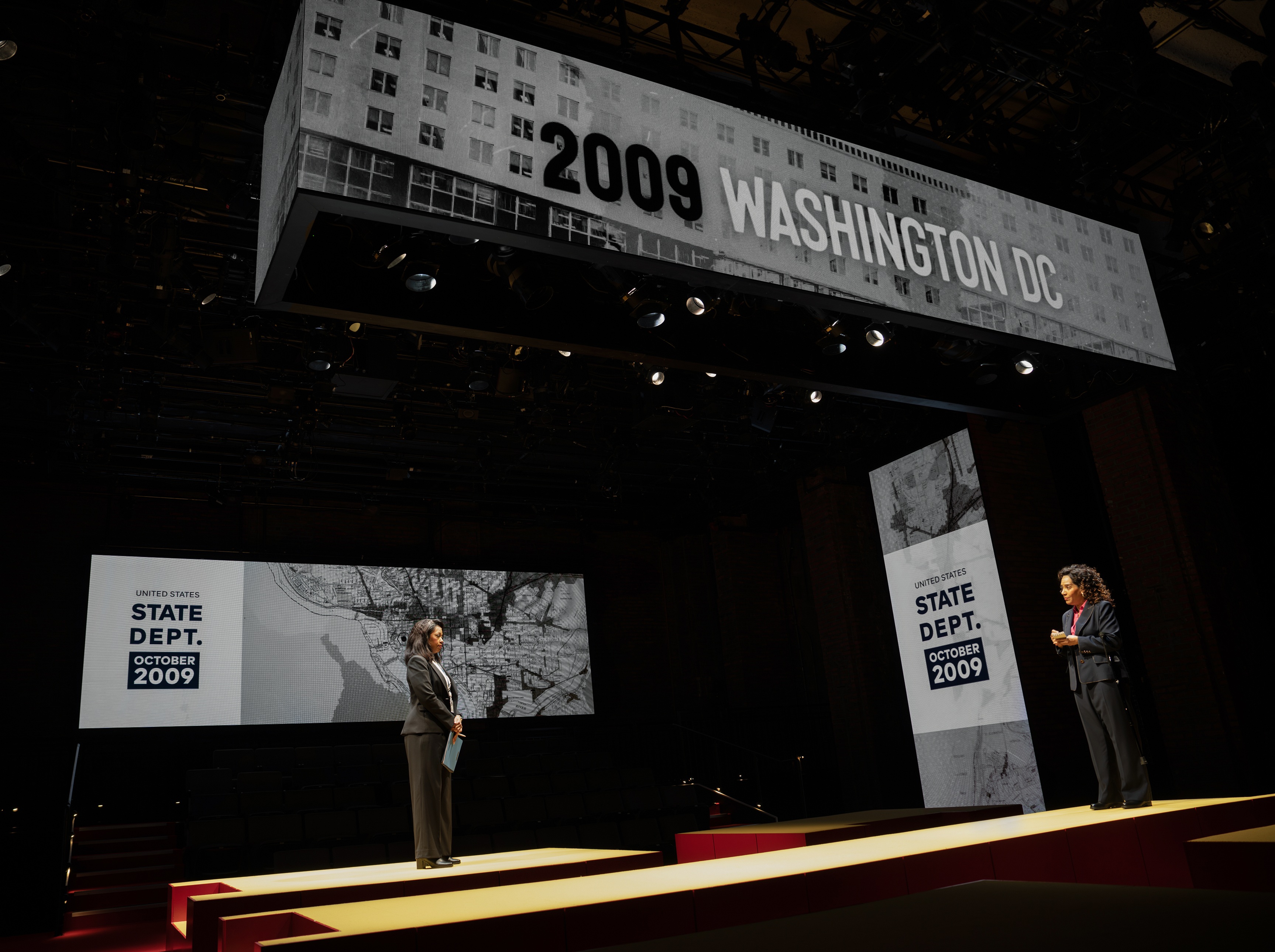 The staging, as designed by Arnulfo Maldonado (Broadway’s Buena Vista Social Club), reflects this measured approach. Platforms map the shifting geography of the story, mirroring the institutional world being portrayed. But the approach also creates an awkward distance between the individual performers, their intimate conversations, and ultimately, the audience. Even with the superb lighting by Ben Stanton (Broadway’s Maybe Happy Ending) and video by Lucy MacKinnon (Public’s White Noise), the layout keeps the emotional core just out of reach.