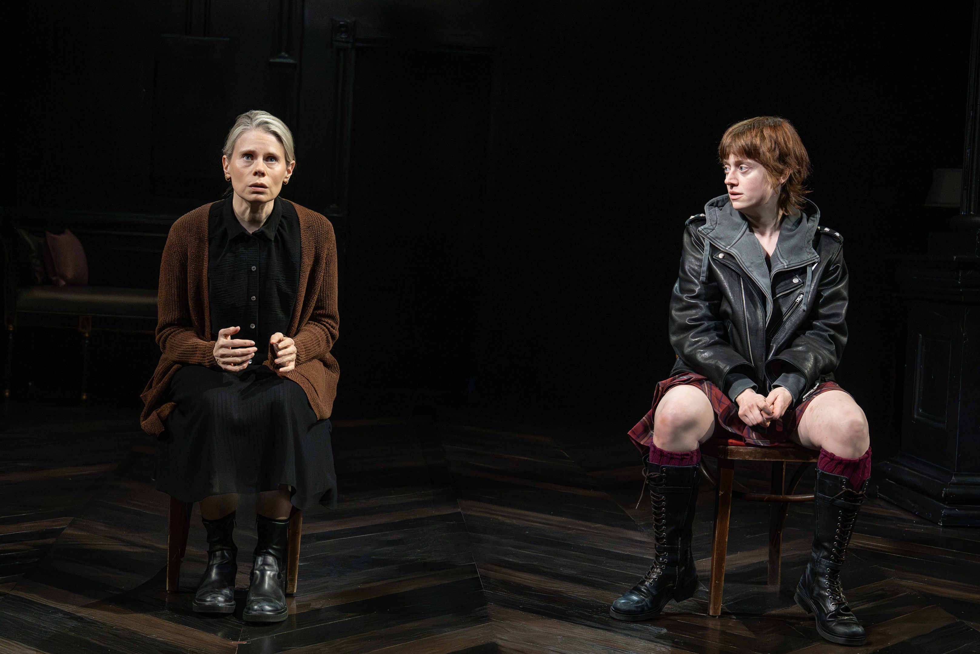 Around them, the world takes on its own unique shape with precision. The design, led by scenic designer David Zinn (Broadway’s Liberation), shifts fluidly between past and present, grounding the play’s more abstract ideas in something tangible. The costumes by Enver Chakartash (Broadway’s English) and lighting by Jen Schriever (Broadway’s Art) work in tandem to support that movement, allowing the production to slide between historical reference and contemporary urgency without losing its visual coherence.