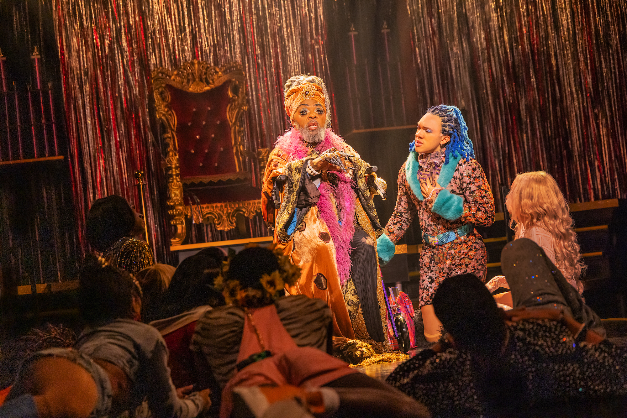 The production’s visual and cultural framing is where it fully reveals its ambition. Designed with runway precision by Rachel Hauck (Broadway’s Hadestown), the stage becomes a competitive ballroom space that feels both celebratory and historical. Dropping dead out on a long runway space running from the front row to the judges’ table, the newly formed megamusical delivers its mega reframing with an African-American and Latino underground LGBTQ+ subcultural slant, rolled out with pride and self-assurance. Lighting by Adam Honoré (Broadway’s Ragtime) and sound by Kai Harada (Broadway’s The Band’s Visit) shape the environment with clarity and pulse, while projections by Brittany Bland ground the evening in the lived history of ballroom culture, its triumphs, its losses, and the generations that carried it forward.