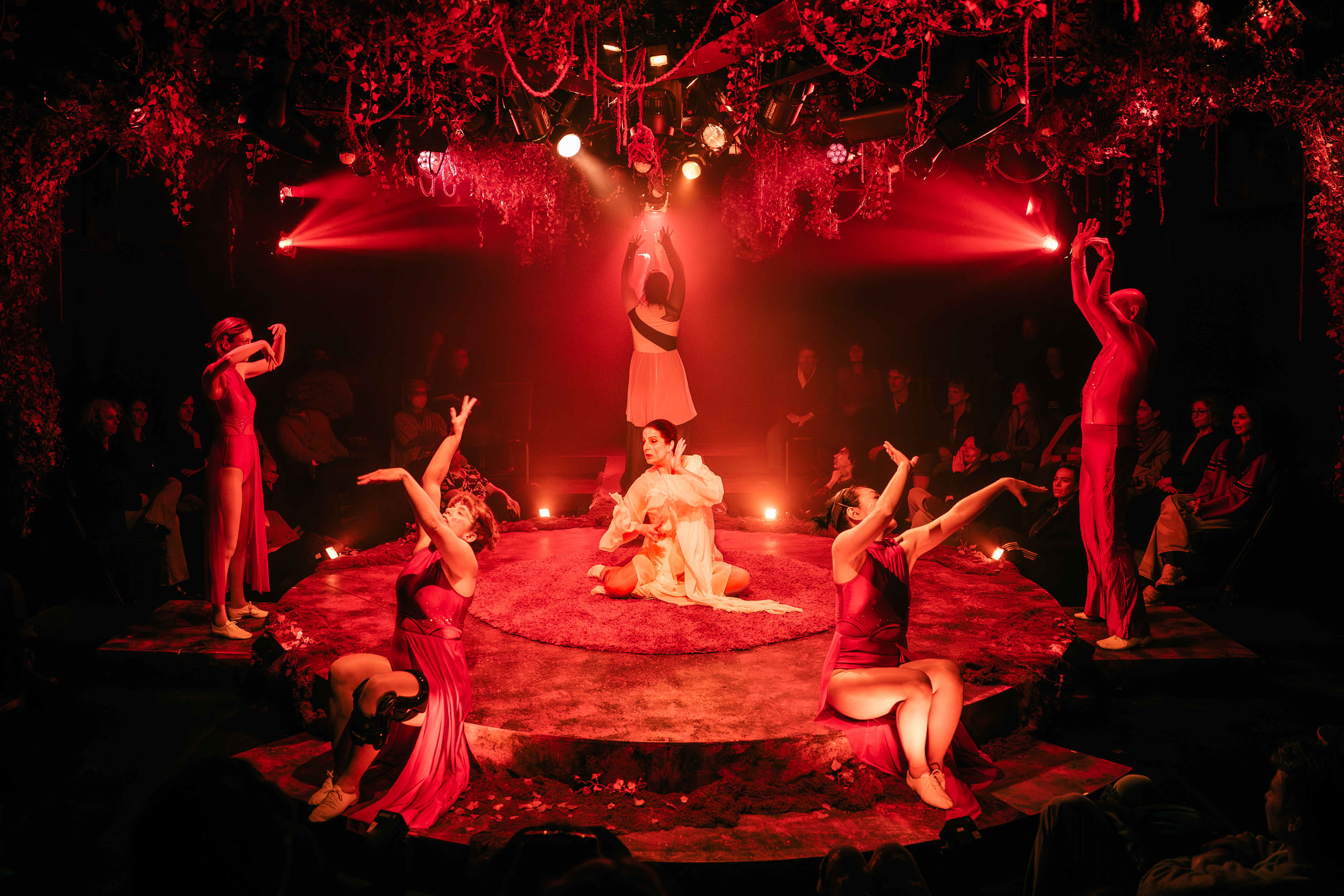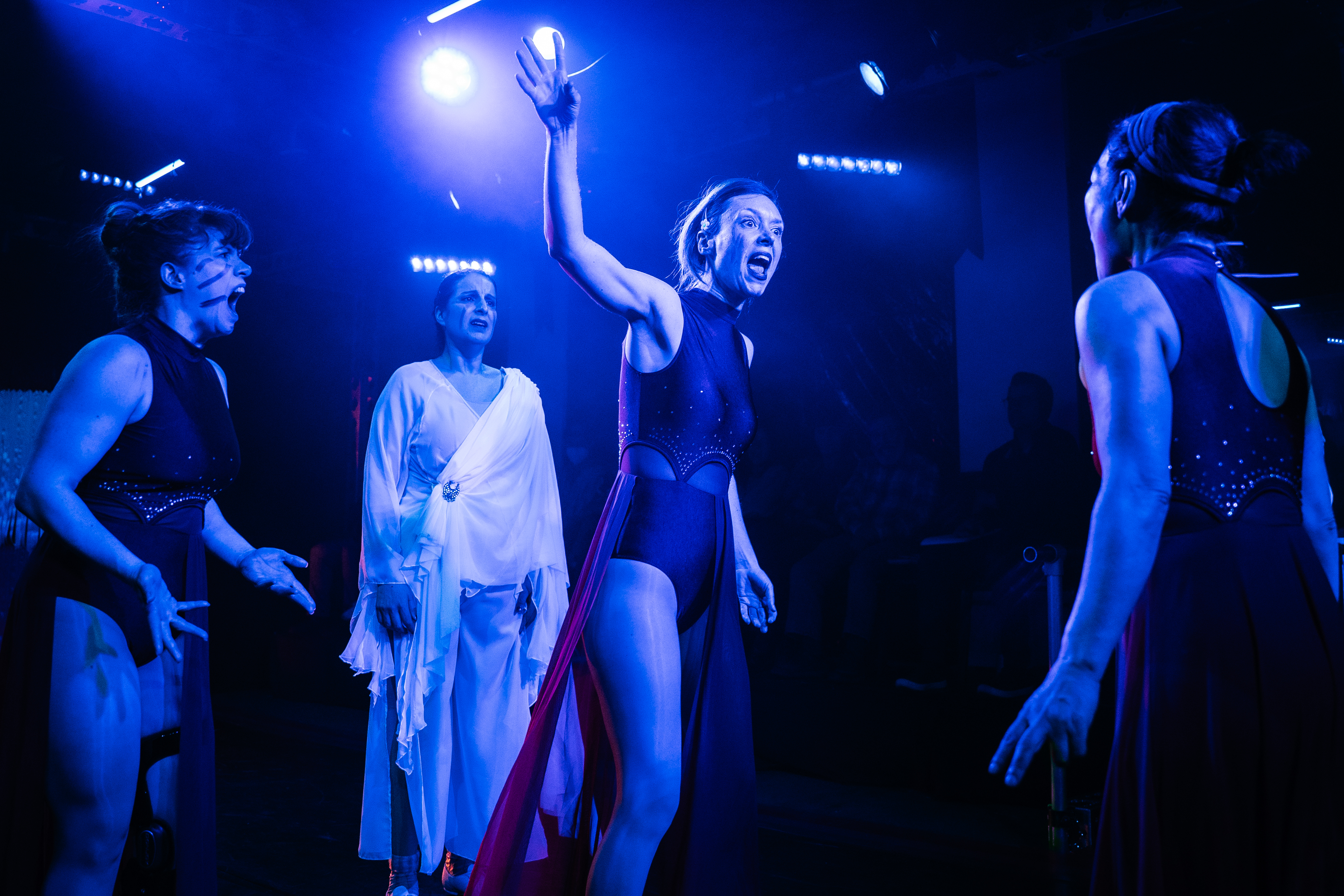 Director Diana Bentley (Coal Mine’s People, Places & Things), alongside movement director Alyssa Martin, leans fully into that instability, and it works beautifully. The choreography does not simply decorate the narrative. It becomes the pulse of the story. The ensemble moves with a kind of Bacchic intensity during certain moments, pushing them all past precision into something raw and almost uncontainable. Group numbers surge with ferocious, sharp-toothed energy, but it is in the fractures, the moments where the choreography strains or slips, that the production reveals its most telling textures. The body becomes both an instrument and a battleground, where control and creation are constantly negotiated and rarely secured.