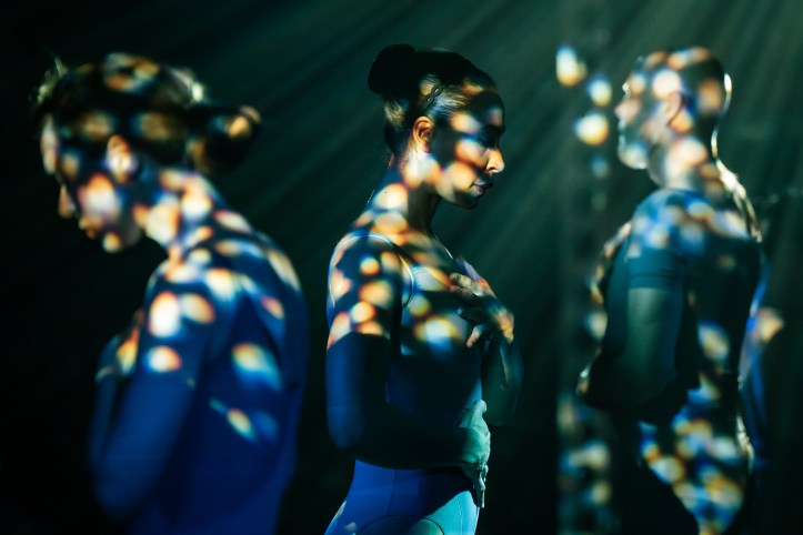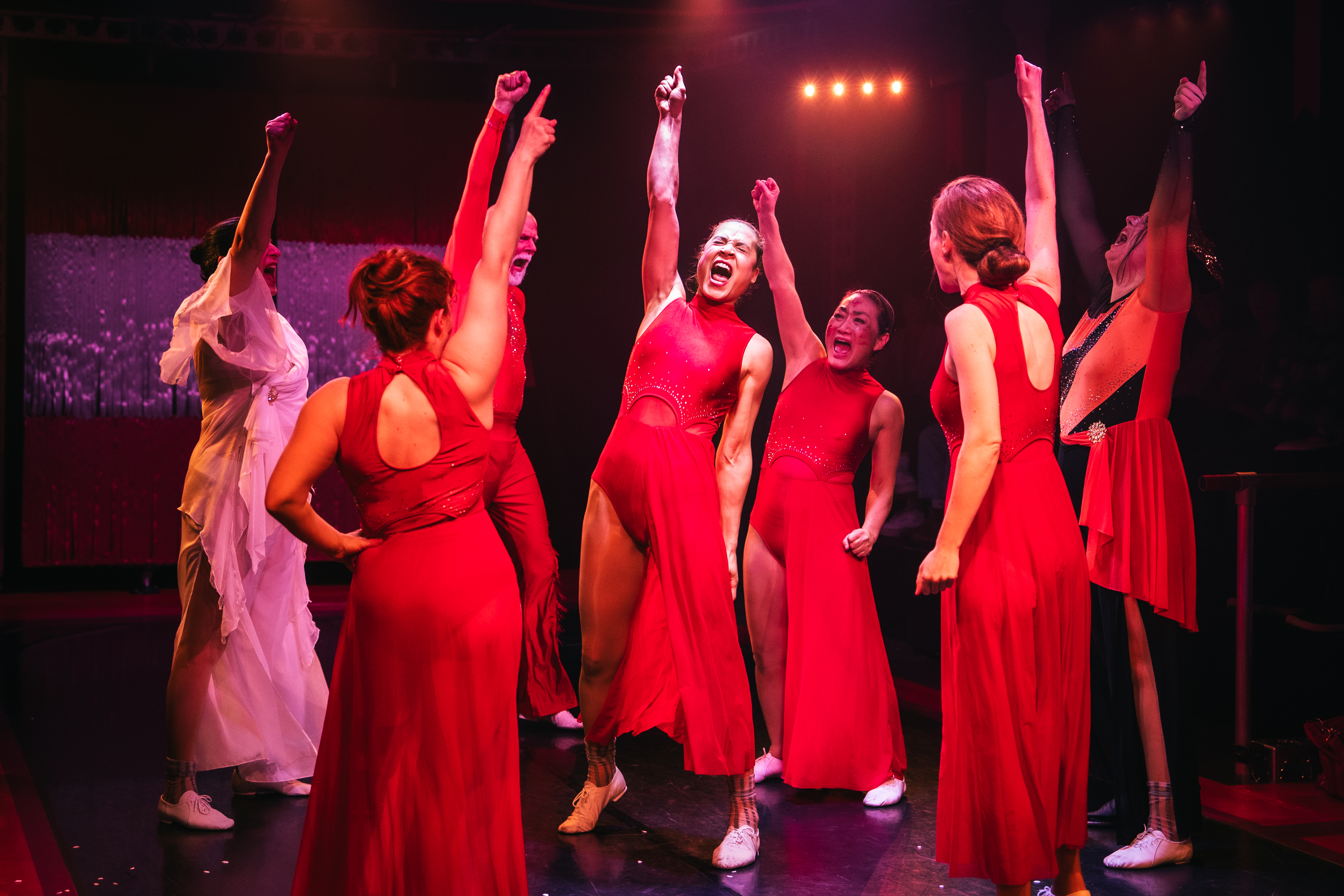 The design created by Nick Blais (Coal Mine’s The Effect) reshapes the space in ways that feel experiential. The transition from a runway-like strip into a more immersive, surrounding environment does not follow a clear architectural logic, but it lands with a disorienting emotional force. It mirrors the internal disorientation of the characters, pulling the audience into a world that feels heightened and unsteady. Costumes by Kathleen Black (TIFT’s Cock) ground the dancers in a recognizable competitive aesthetic while allowing flashes of individuality to break through, and Miquelon Rodriguez’s sound design underscores the shifting emotional terrain with precision, carrying us from heightened performance into quieter, more vulnerable spaces.