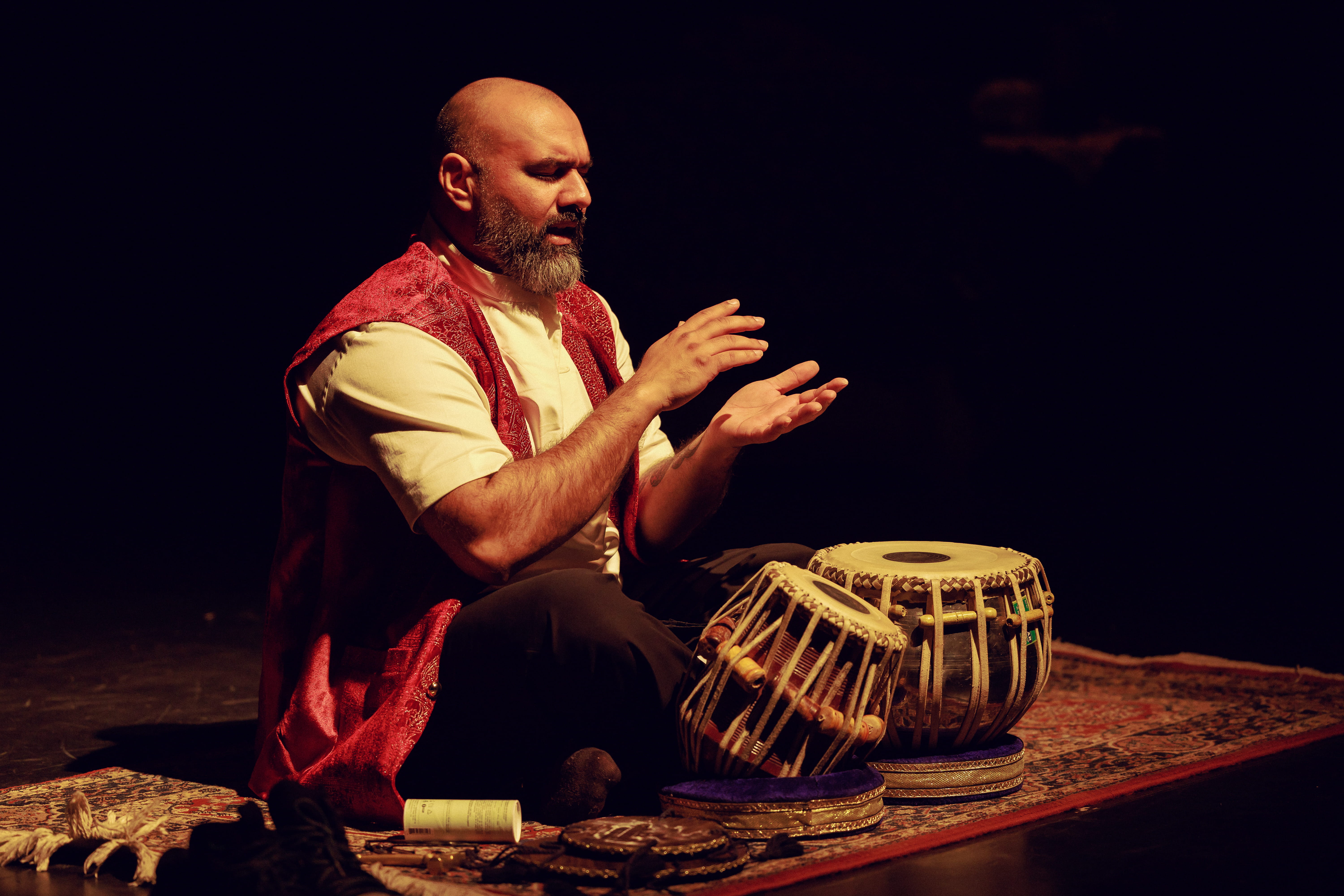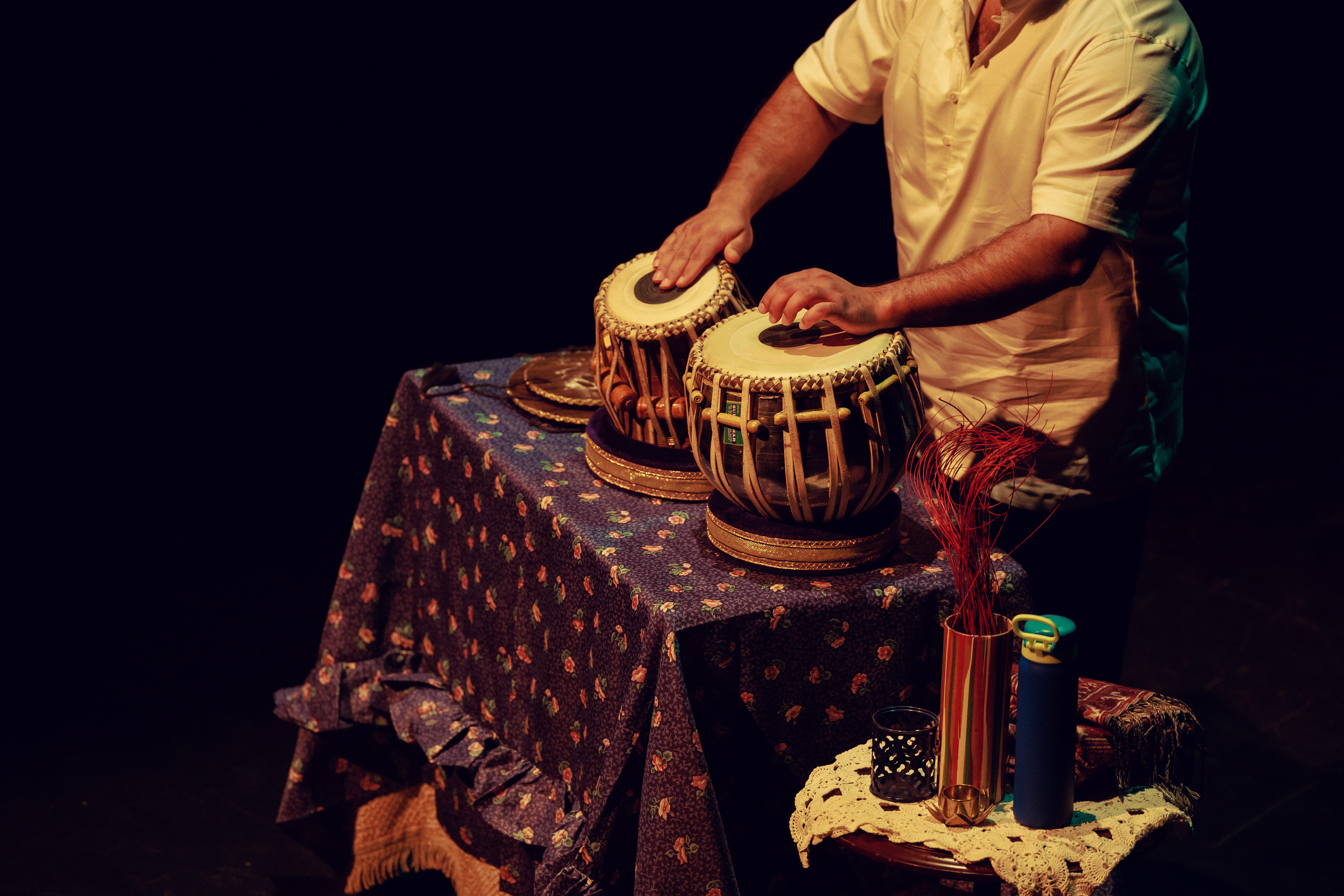 At the centre of that journey is the tabla, a Northern Indian percussion instrument consisting of two hand drums. A gentle teacher, Nawaaz, starts by introducing the instrument and its system of spoken rhythm syllables called bols. Learning tabla takes years of intensive study, yet Nawaaz lends the audience his ear so we understand the basics of this complex instrument. The tabla becomes deeply personal as it weaves throughout a one-act solo show that blends storytelling and music.